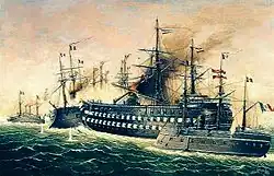 ![]() Tegetthoff v bitvě u Visu (uprostřed) na obraze Antona Romaka | |||