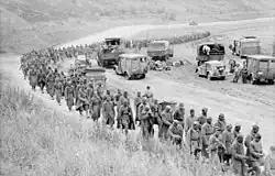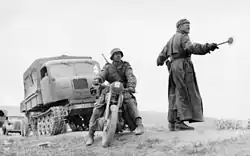 Postupující německá pěchota, v pozadí zničený sovětský tank KV-1