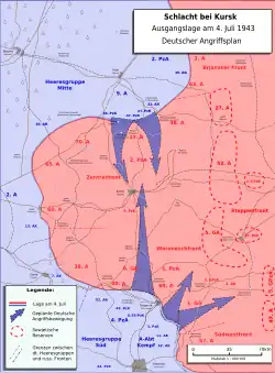 Skupina armád Střed (velitel útoku Walther Model) a skupina armád Jih (Erich von Manstein) měla zaútočit na „krk“ Kurského oblouku ve směru kousek na východ od města Kursk s cílem odříznout město i celý oblouk a sovětské jednotky zde se nacházející. Hitler si sliboval hodně jak od zničení jednotek nacházejících se v oblouku, tak od obranných bojů, které začnou, až se Rudá armáda pokusí své obklíčené jednotky osvobodit. Plán evidentně musel vyústit v gigantickou bitvu, proto se k jeho provedení shromáždila většina tankových sil obou skupin armád i další strategické zálohy. Přesto panovaly oprávněné pochybnosti, zda mají obě útočná uskupení dostatek prostředků k provedení akce.[zdroj?]