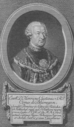 - ↑ KONEČNÝ, Michal, CERMAN, Ivo: Tváře osvícvenství; Národní památkový ústav Kroměříž, 2021 (kapitola Jindřich Kajetán z Blümegenu); s. 94–97 ISBN 978-80-907400-8-2