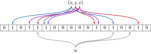 - Podíváme se na hodnoty pole na pozicích . Pokud je aspoň jedna z nich 0, můžeme s určitostí říct, že prvek x se v množině nenachází, protože jinak by byly všechny tyto hodnoty při jeho vložení nastaveny na 1. Pokud jsou všechny tyto hodnoty 1, potom sice s určitostí nelze říct nic, ale aspoň pro menší počet prvků v množině je relativně vysoká pravděpodobnost, že prvek x se v množině nachází. Proto je výstupem algoritmu zjištění, že prvek se v množině nachází, je potřeba ale počítat s možností chyby.