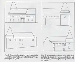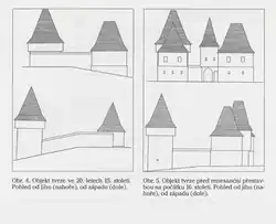 „... v období vrcholící renesance, vzniká mezi oběma středověkými budovami zděné křídlo, budovy vstupního traktu, vlivem postupného růstu půdorysně neuspořádané, jsou v čelní linii sjednoceny a doplněny o zděné patro. V koutě nádvoří současně vzniká hranolové schodiště, vystavěné z druhotně použitého lomového kamene, získaného při odstranění některých starších konstrukcí při úpravách v interiéru. Takto upravená a zřejmě a zřejmě také vybavená velkými sálovými prostorami a rovněž soukromou kaplí, vstupuje tvrz do počátku 17. století...“[18]