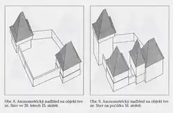 Axonometrická projekce předpokládané podoby tvrze a jejího okolí během druhé poloviny 15. století (kresba: Jan Heřman)