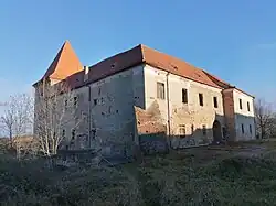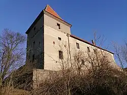 Pohled na tvrz od jihozápadu. Na snímku lze vidět později přibudovaný rohový opěrný pilíř.