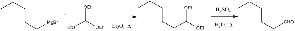 Reakcí Grignardova činidla s triethylorthoformiátem vzniká acetal, který se hydrolyzuje na aldehyd. Zde je zobrazena příprava n-hexanalu:[1]