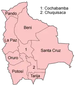 Bolívie je unitární stát, který se skládá z 9 departementů. Všechny mají svou vlajku. Některé vlajky mají ve správní podobě uprostřed vlajky znak departementu.