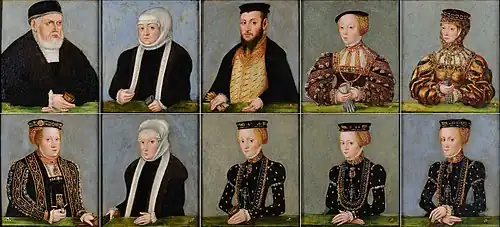 Lucas Cranach mladší, deset miniatur členů Jagellonské rodiny z roku 1565. Zleva v horní řadě Zikmund I. Starý, Bona Sforza, Zikmund II. August a jeho první dvě manželky Alžběta Habsburská a Barbora Radziwiłłovna; v dolní třetí manželka Zikmunda II. Augusta Kateřina Habsburská, Isabela Jagellonská, Kateřina Jagellonská, Žofie Jagellonská a Anna Jagellonská.