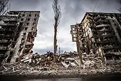 Během ruské invaze na Ukrajinu v roce 2022 zde došlo 3. března k těžkým bojům, při kterých bylo zničeno několik budov. 30. března se ruské síly stáhly do Běloruska. Dále až do 5. dubna následovalo systematické ostřelování a bombardování, při kterém byla zničena většina budov a infrastruktury města. Po osvobození od Rusů bylo město nejdříve odminováno, vyhledány a pohřbeny oběti, kterých bylo nalezeno kolem 400. Další tři desítky osob se dosud pohřešují.[1]