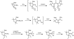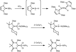 - ↑ a b RUIZ, David A.; MELAIMI, Mohand; BERTRAND, Guy. An efficient synthetic route to stable bis(carbene)borylenes [(L1)(L2)BH]. Chemical Communications. 2014-06-24, s. 7837–7839. ISSN 1364-548X. doi:10.1039/c4cc03497j. PMID 24909943. (anglicky)