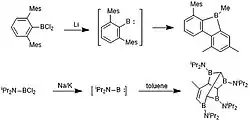 - ↑ GRIGSBY, Warren J.; POWER, Philip P. Isolation and Reduction of Sterically Encumbered Arylboron Dihalides: Novel Boranediyl Insertion into C−C σ-Bonds. Journal of the American Chemical Society. 1996-01-01, s. 7981–7988. ISSN 0002-7863. doi:10.1021/ja960918j.