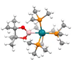 - ↑ BORNER, C.; BRANDHORST, K.; KLEEBERG, C. Selective B–B bond activation in an unsymmetrical diborane(4) by [(Me 3 P) 4 Rh–X] (X = Me, OtBu): a switch of mechanism?. Dalton Transactions. 2015, roč. 44, čís. 18, s. 8600–8604. Dostupné online [cit. 2023-11-11]. ISSN 1477-9226. doi:10.1039/C5DT00618J. (anglicky)