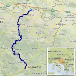 Řeka pramení na úpatí pohoří Igman, v blízkosti města Ilidža v nadmořské výšce 500 m. Od svého pramene teče směrem na sever, skrz park Zřídlo Bosny[1], kde ji překonává historický Římský most. Nedlouho od svého pramene nabírá řeka Bosna přítoky Željeznica a Zujevina, které dávají řece hodně vody. Řeka následně směřuje dále směrem na severozápad, kde se do ní vlévají Dobrinja a Miljacka. Poté řeka směřuje pryč z Sarajevské kotliny. Cestou od hlavního města Bosny a Hercegoviny nicméně také nabírá nemalou část odpadu, který produkuje průmyslová zóna v blízkosti Nového Sarajeva. Řeka je zde velmi mělká; z hor nabírá spoustu písku a dalších sedimentů a v jejím korytu tak vznikají časté ostrovy.