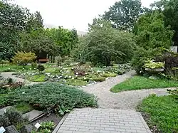 Základem byly dvě elipsy, v každé v nich byl bazén pro vodní a bahenní rostliny. Údržba byla v letech 1950–1960 hodnocena jako nevalná, rostliny byly zaplevelené nebo nedoplněné, protože se často měnil personál. Místo přírodních rostlin byly po roce 1960 vysázeny skalničky a trvalky. V roce 1977 bylo v botanické zahradě 1500 označených taxonů z různých částí světa. Okrasné dřeviny byly vysázeny jako estetické doplňky, hlavní význam měla botanická sbírka. Součástí bylo rozárium s 50 kultivary růží.[6]