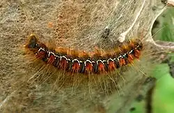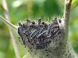 Housenky se líhnou v květnu a ihned po vylíhnutí si upředou společné hnízdo, v němž zprvu žijí. Živnou rostlinou bývá nejčastěji bříza, hloh či trnka, v alejích pak také lípy, švestky či třešně. Housenky se během svého 5 týdnů trvajícího vývoje osamostatňují, v posledních fázích už žijí jednotlivě a jednotlivě se také kuklí na úrovni země, kde si spřádají zámotky.[1][2][3]