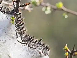 Housenky se vyvíjejí mezi květnem a červencem následujícího roku. Po vylíhnutí si spřádají hnízdo z hedvábných vláken, ve kterém tráví první týdny života. V pozdějších fázích vývoje housenky hnízdo opouštějí a potravu si hledají samostatně. V této fázi také přecházejí na rozmanitější potravu – nevyžadují už jen hloh nebo trnku, ale mohou konzumovat i jiné druhy stromů – topoly, jívy, břízy aj.[4] V závěru svého vývoje slézají na úroveň země, kde si v nízké vegetaci upředou pevný kokon, ve kterém se kuklí.[2]