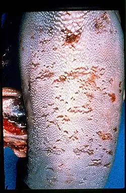 - BVD - deprese, horečka, hypersalivace, hlenohnisavý výtok z nosu a očí, průjem s krví a útržky sliznic, erozena mulci a sliznici dutiny ústní, u mláďat imunodeficience, potraty