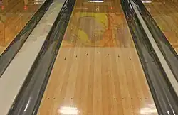 Povrch dráhy je z lakovaného dřeva, přičemž prvních 15 stop (cca 4,57 m) je vyrobeno z javorového dřeva (kvůli jeho schopnosti odolat nárazu nejtěžší, 16 librové koule) a zbytek je z borovice. Dráha je obvykle ošetřena olejem.[29] Pro snazší míření jsou na dráze orientační body.[28] Na začátku dráhy je obvykle osm teček (anglicky dots) a ve vzdálenosti 12 stop od čáry přešlapu je sedm šipek (anglicky arrows).[28] Další čtyři řady teček jsou umístěny i v prostoru rozběžiště.[28][35] Jak tečky, tak šipky jsou umístěny symetricky podle podélné osy dráhy.[29]