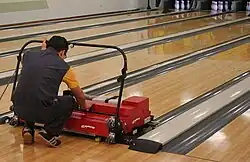 Ošetřování dráhy se provádí nanášením vrstvy minerálního oleje sloužící jako ochrana proti jejímu poškození, aby se dráha ochránila před vysokou teplotou, která vzniká při dopadu koule.[36] Nanášení provádí pracovník bowlingové herny pomocí speciálního mazacího stroje, který nejprve setře olej stávající a pak nanese vrstvu novou. Přemazávání se na významných turnajích provádí buď po odehrání 24 her nebo po 3 hodinách hry.[37] Vrstva se nenanáší po celé dráze rovnoměrně. To, jak je olej na dráze rozprostřen, určuje tzv. „mazací model“. Průměrná délka namazané plochy je 39 stop. Délka do 35 stop se považuje za krátké mazání a do 45 stop je mazání označováno za dlouhé. Každá herna má též svůj vlastní mazací model označovaný jako „house“, tedy domácí.[38]