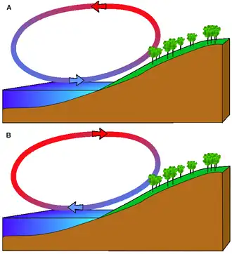 V noci si vodní plocha zachovává své teplo déle než pevnina. Vzduch nad pevninou je studenější a tlačí se pod vzduch nad vodní plochou, který je teplejší a stoupá vzhůru, kde se stáčí nad pevninu a postupně se ochlazuje.