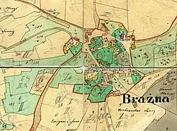V roce 1839 byla zhotovena první katastrální mapa obce a sepsán tzv. Stabilní katastr. V tomto soupisu jsou uvedeni pod sedmnácti čísly popisnými tito majitelé: Matěj Sedlák (sedlák), Bartoloměj Pšenička (domkář), Václav Beneš (domkář), František Kolář (domkář), František Kolář (sedlák), Jan Lacina (sedlák), obecní dům, František Hejna (domkář), František Vondráček (sedlák), Václav Chýle (sedlák), Jan Krejčí (domkář), František Šibal /nebo Schejbal?/ (sedlák), Rosalie Kalivodová (domkářka), Marie Havlová (sedlák), František Votlučka (sedlák), Josef Lukeš (sedlák) a Josef Vondráček (domkář). Z nich tito stvrdili 7. srpna 1839 svými podpisy správnost nové katastrální mapy (při přepisu respektovány zvláštnosti tehdejšího pravopisu): „Mates Sedlak končel, František Kolař saused, Waclav Chyle tež, Franc Wotlučka tež, František hejna teš“. Nad těmito podpisy sousedů z Bražné je podpis představeného vyměřovací komise Josefa Krotta a jinde na téže mapě podpis Wenzla Johna, politického komisaře pro celé panství Vysoký Chlumec. Mapa je uložena v Národním archivu.