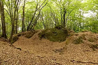 Na západním úpatí vrchu se nalézají rozsáhlé, do pískovce tesané prostory. Různě velké místnosti, výklenky a větvící se chodby zde tvoří naprostý pískovcový labyrint.[2]