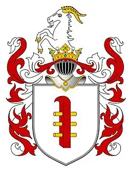 Původním erbem rodu byl válečný žebřík se zlatými příčkami na stříbrném poli. Po povýšení 4. března 1674 byl štít rozčtvrcen a k žebříku (1. a 4. pole) přibyl korunovaný bílý kozel se zlatými rohy a korunkou, stojící na červeném cimbuří věže na modrém poli (2. a 3. pole). Uprostřed jako polepšení byl černý štítek, v němž byla mezi zlatými iniciálami CM zlatá císařská koruna na červené podušce. K původnímu klenotu, lvu držícímu žebřík, přibyly další dva – s korunovanou orlicí (ve středu) a s kozlem (vlevo).