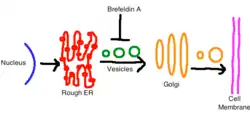 Brefeldin A nepřímo inhibuje přenos proteinů z endoplazmatického retikula do Golgiho aparátu tím, že brání jejich navázání na komplex COPI.[3]