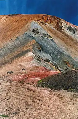 Obrázky, zvuky či videa k tématu Brennisteinsalda na Wikimedia Commons - Fotografie části hory s turistickou stezkou Laugarvegur v popředí (anglicky)