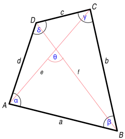 Zde, a, b, c, d jsou strany, s je poloviční obvod, a α a γ jsou dva protilehlé úhly.