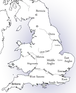 - ↑ STENTON, F. M. Anglo-Saxon England. 3rd. vyd. Oxford: University Press, 1971. S. 34–35..