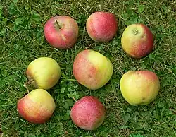 Plody jsou kuželovité až vejčité, mírně nesouměrné, střední až menší. Slupka je hladká, lesklá, mírně mastná, s nenápadnými světlými lenticelami. Barva slupky je světle zelená, později žlutá s výrazným rozmytým červeným líčkem. Dužnina je zlatožlutá až do oranžova, křehká, sladká, aromatická. Chuť bývá hodnocena jako dobrá až velmi dobrá. [1]