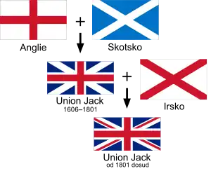 Roku 1606 byla vytvořena nová, společná vlajka, která se zatím používala pouze na lodích. Vlajka spojila anglickou vlajku (červený kříž na bílém pozadí, známý jako kříž svatého Jiří) a skotskou vlajku (bílý, diagonální kříž na modrém pozadí, označovaný jako kříž svatého Ondřeje). Vlajka Walesu (kříž svatého Davida) zahrnuta nebyla, protože Wales byl připojen k Anglii již o 70 let dříve.