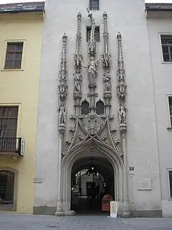 Pověst vysvětluje, proč je jedna z fiál (věžiček) gotického portálu na Staré radnici křivá. Brněnští radní zadali schopnému staviteli Antonu Pilgramovi, aby vybudoval reprezentativní portál k radnici. Dohodli se s ním i na odměně a Pilgram začal stavět. Když však byl portál již téměř hotov, radní se při myšlence, že budou muset platit sjednanou sumu, začali ošívat a vymlouvat. Po dobrém to s radními nešlo a tak se Pilgram rozhodl za jejich drzost "pomstít" po svém a poslední věžičku na portálu pokřivil, aby ukázal, jak křivé je jednání brněnských radních. Než se nadáli, byl Pilgram pryč a již nebyl nikdo, kdo by věžičku napravil.