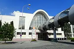 Hlavní vstup do areálu se nachází na východní straně. Jednopatrová kruhová budova byla počátkem šedesátých let prodloužena a na jejím jižním konci vznikla výšková správní budova. Před vstup bylo instalováno sousoší Vincence Makovského Nový Věk, které je v druhém odlitku umístěno i před budovou bývalého Federálního shromáždění, dnes Novou budovou Národního muzea.