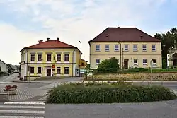 V sousedství kostela křižovatka silnic, budova obecního úřadu, základní škola i hlavní autobusová zastávka v obci.