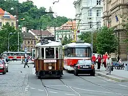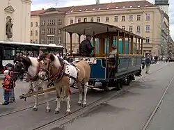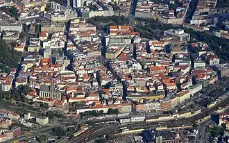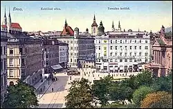 V roce 1777 bylo založeno brněnské biskupství,[37][pozn. 4] roku 1839 přijel do Brna první vlak z Vídně, čímž začal provoz parostrojní železnice na území dnešní České republiky.[38] Roku 1850 bylo Brno poprvé administrativně rozšířeno připojením 20 okolních katastrálních území.[30][pozn. 5] V letech 1859–1864 bylo zbořeno téměř kompletně celé městské opevnění, v letech 1896–1916 proběhla v historickém jádru rozsáhlá asanace,[42] při níž bylo asi 240 domů[43] nahrazeno novostavbami nebo zcela odstraněno. Roku 1869 v Brně poprvé na území dnešního Česka vyjela do ulic města tramvaj, tehdy tažena koňmi.[44]