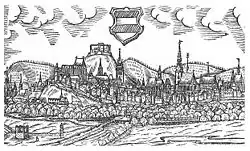 Znak Markrabství moravského v Knize stavu panského s vyobrazenou vedutou Brna (rok 1670)