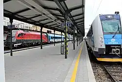 Souprava RailJet na 1. nástupišti. (způsobilá též pro rychlá spojení)