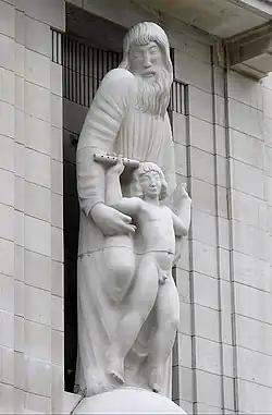 Nad hlavním vchodem do budovy stojí sousoší Ariela a Prospera z Shakespearovy divadelní hry Bouře, které vytvořil sochař Eric Gill. Prospero byl čaroděj a Ariel vzdušný duch, sousoší tak symbolizuje rozhlasové vlny šířící se vzduchem.[4] Některé Brity po dokončení budovy pohoršil odhalený penis malého Ariela, stížnostmi na toto téma se zabýval dokonce i britský parlament. Mezi zaměstnanci i na veřejnosti se rozšířila zpráva o tom, že tehdejší generální ředitel BBC John Reith sochaři nařídil Arielovo přirození zmenšit. Vedoucí divize BBC History Robert Seatter to v roce 2012 označil za mýtus.[5]
