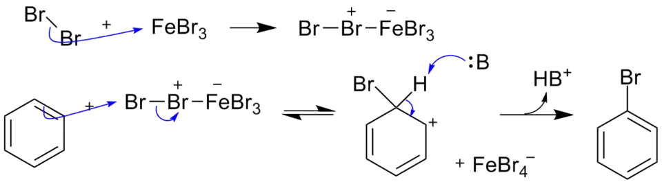Bromace benzenu za přítomnosti bromidu železitého. Nejprve dojde k navázání molekuly bromu na bromid železitý, následně tato molekula odštěpí atom vodíku z uhlovodíku, který reaguje s FeBr5 železa za vzniku FeBr5H, který se rozpadne na bromovodík a na FeBr -