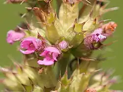 Dlouhé, přerušované květenství je tvořeno několika lichopřesleny, které jsou navzájem 3 až 5 cm vzdálené. Bývají tvořeny deseti a více drobnými, oboupohlavnými, do 7 mm velkými narůžovělými květy, které mají kratičké stopky vyrůstající z paždí úzkých listenů. Květ je tvořen zvonkovitým, asi 5 mm dlouhým, světlezeleným kalichem s pěti trojúhelníkovitými lístky a přímou trubkou. Koruna je dvoupyská, bledě růžová, její horní pysk je vejčitý, skloněný a menší než třílaločný spodní. V květu jsou čtyři tyčinky s nitkami o stejné délce a pestík se čtyřdílným semeníkem a dvoulaločnou bliznou.
