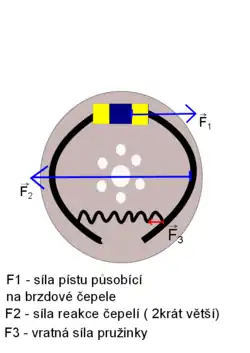 - Naopak úběžná čelist je třecím momentem ze záběru vytlačována, čímž se snižuje její brzdná síla a dochází k nerovnoměrnému opotřebení brzdových čelistí.