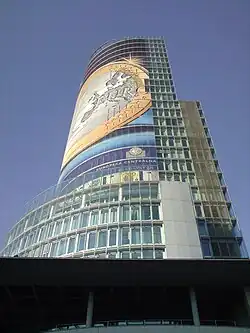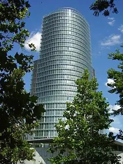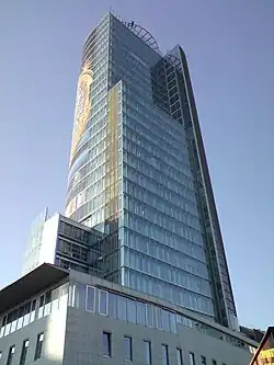Výšková část vyrůstající z podstavy je formována jako stupňovitá věž. Půdorysně je komponovaná jako skelet kolem betonového pevného jádra s metalicko-skleněným opláštěním. Zvláštní materiálově-výtvarný charakter vytváří skleněný dvojitý plášť klimatické fasády.