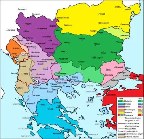 Londýnská smlouva, která ukončila první balkánskou válku, definovala přesně území, o která Osmanská říše přišla, ale jejich rozdělení ponechala na spojencích. Demarkační linie vznikly tam, kde se zastavily armády. Bulharsko, které neslo hlavní tíhu války, mělo za cíl získat podstatnou část Makedonie až k Ochridu a v tomto duchu v roce 1912 podepsalo se Srbskem tajnou dohodu o rozdělení Vardarské Makedonie. Toto území však obsadila srbská armáda a Srbsko chtělo tajnou dohodu revidovat, protože jeho válečný cíl zajistit si přístup k moři zhatily evropské velmoci tím, že si vynutily vznik samostatné Albánie. Aniž by se o sporných bodech významněji jednalo napadlo Bulharsko v červnu 1913 srbskou a řeckou armádu. Útoky byly odraženy a řecké a srbské armády vstoupily na území ovládané Bulharskem. Současně Osmané vstoupili do východní Thrákie a znovu dobyli Drinopol. Do války se se zpožděním vložilo Rumunsko a ze severu postupovalo do bulharského vnitrozemí. Izolované a obklopené silnější koalicí nepřátel bylo Bulharsko nuceno souhlasit s příměřím a mírovými jednáními.