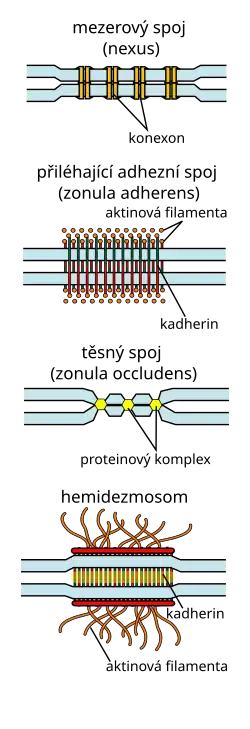 Adhezní spoj, neboli zonula adherens, je tvořen proteiny kadheriny. Provází těsné spoje na epitelech a tvoří pás níže pod jejich úrovní. Plní funkci jako pevný mechanický úchyt, díky němuž buňky pevně drží pospolu. Tato pevnost je dána provázáním adhezních spojů s buněčnou kostrou, cytoskeletem. Z vnitřní strany se totiž na adhezní spoj vážou vlákna aktinu (mikrofilamenta).[2] S tímto typem spojů je provázána skupina dalších proteinů, které regulují buněčnou adhezi – k těmto proteinům patří Rap1 GTPáza či β-katenin.[3]