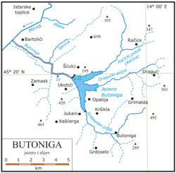 V tomto článku byl použit překlad textu z článku Butoniga (jezero) na chorvatské Wikipedii.