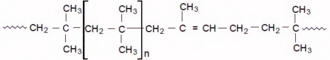 Butylkaučuk vzniká kationtovou kopolymerací isobutylenu s izoprenem. Řetězce se skládají z isobutylenových jednotek, mezi nimiž jsou nahodile rozmístěny izoprenové jednotky vázané převážně v poloze trans-1,4.[4]