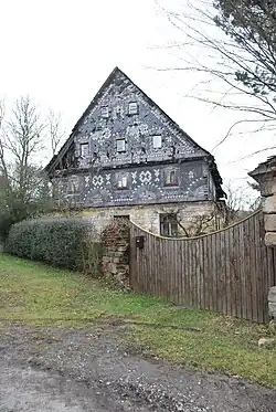 Nejcennější stavbou ve vsi je dům čp. 16 se zděným přízemím, kamennými portálky chlévů a pásovou bosáží zdobenými fasádami. Patro domu, v zadní části přístupné pavlačí s vyřezávanými sloupky, má roubenou konstrukci. Dřevo je obložené barevným břidlicovým obkladem. Dům čp. 9 kombinuje roubené konstrukce v přízemí i v podstávkovém patře, ale zadní část přízemí je zděná a v prvním patře hrázděná. Fasáda zadní části je secesní a pochází nejspíše z dvacátých let dvacátého století. První patro obsahuje zapuštěnou pavlač. Roubené či hrázděné konstrukce mají také domy čp. 27, 28 a 29. Z mladších staveb je významný dům čp. 7 postavený v klasicistním slohu, v jehož lichoběžníkovém štítě se dochovaly zbytky malby Nanebevzetí Panny Marie a druhotně přepsaným vročením 1831.[4]