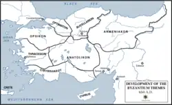 Protože arabští nepřátelé nepostupovali vždy tou samou oblastí, vojáci se tedy v mnoha případech bojů neúčastnili a postupně se usazovali v oblastech, do nichž byli posláni.[24] Tím získávali vztah k půdě a během následujících let se z nich stali vojíni-zemědělci (zvaní stratiotai) mající v případě nepřátelského útoku povinnost nastoupit k vojsku a podílet se na obraně daného thematu. V druhé polovině 7. století se těchto nových správních jednotek v oblasti Malé Asie, jež byla ohrožena nejvíce, konstituovalo několik. Prvními z nich byla themata Anatolikon a Armeniakon, dále Opsikion v oblasti poblíž Konstantinopole, Kibyraioton na jižním pobřeží Malé Asie a další. Spolu s tím vznikla po obléhání Konstantinopole arabskou flotilou námořní jednotka karabisianoi, v jejímž čele stál taktéž stratég a jež měla za úkol vést obranu před arabskými pirátskými nájezdy.[25][26] V byzantském prostředí se ale udržely i profesionální žoldnéřské jednotky zvané tagmata, jež se zdržovaly poblíž hlavního města a krom ochrany císaře se i účastnily vojenských taženích proti nepříteli.[27]