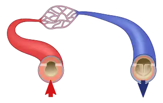 Schéma tepny (se silnou vrstvou svaloviny), vlásečnic (zde dochází k výměně látek s tkáněmi) a žíly (včetně chlopně zabraňující zpětnému toku krve). Tepny se do anatomických schémat obvykle kreslí červeně, žíly modře.